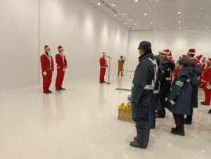 参加者全員がサンタクロースの衣装に着替え、交通安全啓発の出動式を行いました。